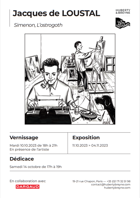 A l'occasion de la publication aux éditions Dargaud du livre Simenon, l'ostrogoth (sortie octobre), une exposition des dessins de Loustal sera proposée à la galerie Huberty & Breyne, 19-21 rue Chapon, Paris 3e, du 11 octobre au 4 novembre.